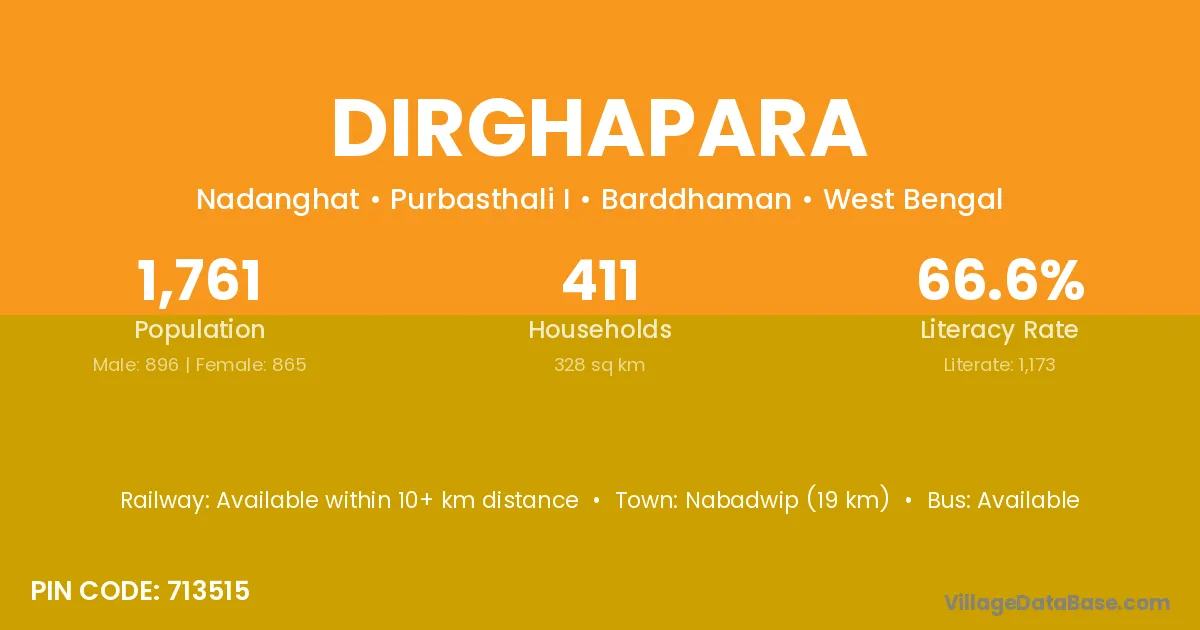 Nabadwip (19 km) is the nearest town to Dirghapara village for major economic activities and is located approximately 19 km away.