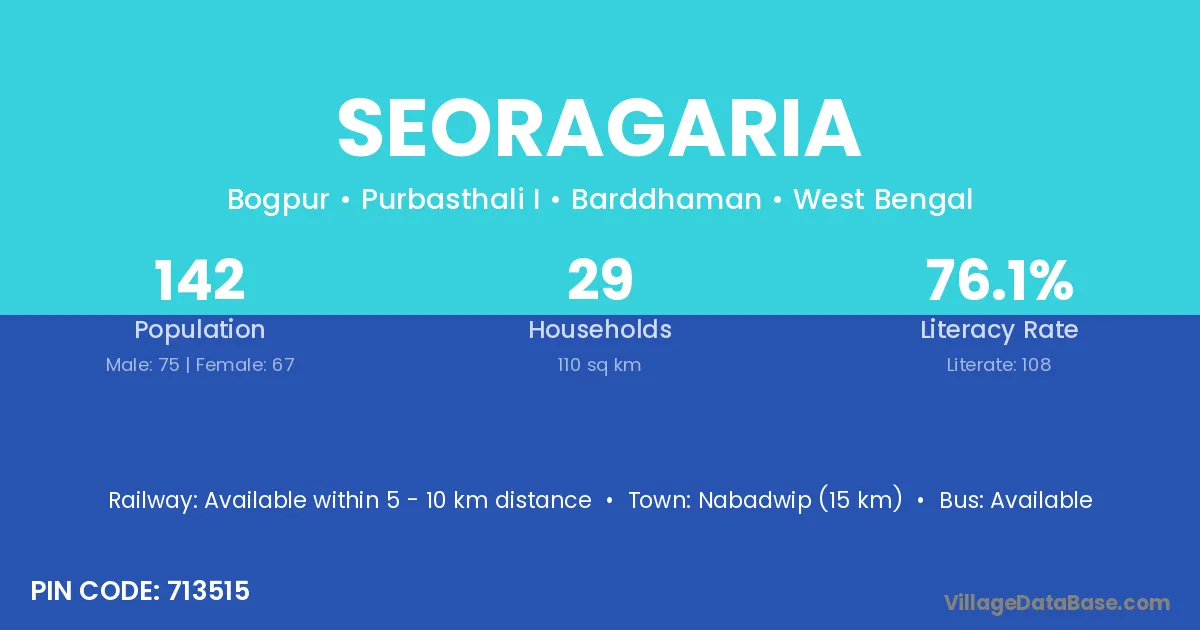 Nabadwip (15 km) is the nearest town to Seoragaria village for major economic activities and is located approximately 15 km away.