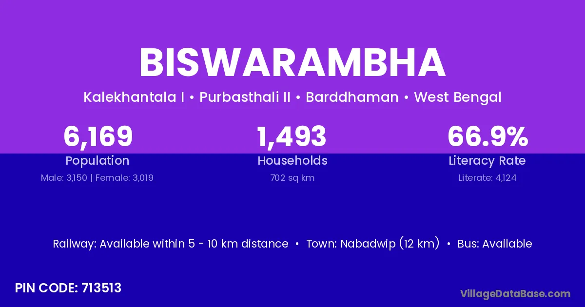 Nabadwip (12 km) is the nearest town to Biswarambha village for major economic activities and is located approximately 12 km away.
