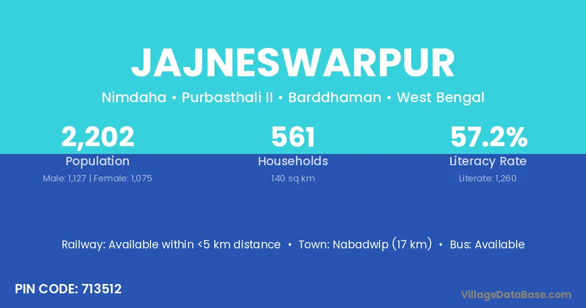 Nabadwip (17 km) is the nearest town to Jajneswarpur village for major economic activities and is located approximately 17 km away.