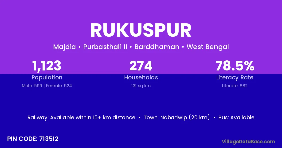 Nabadwip (20 km) is the nearest town to Rukuspur village for major economic activities and is located approximately 20 km away.