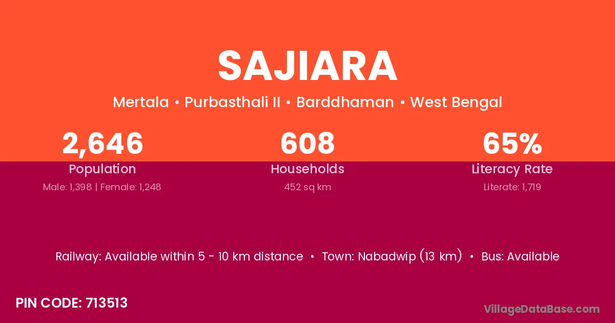 Nabadwip (13 km) is the nearest town to Sajiara village for major economic activities and is located approximately 13 km away.