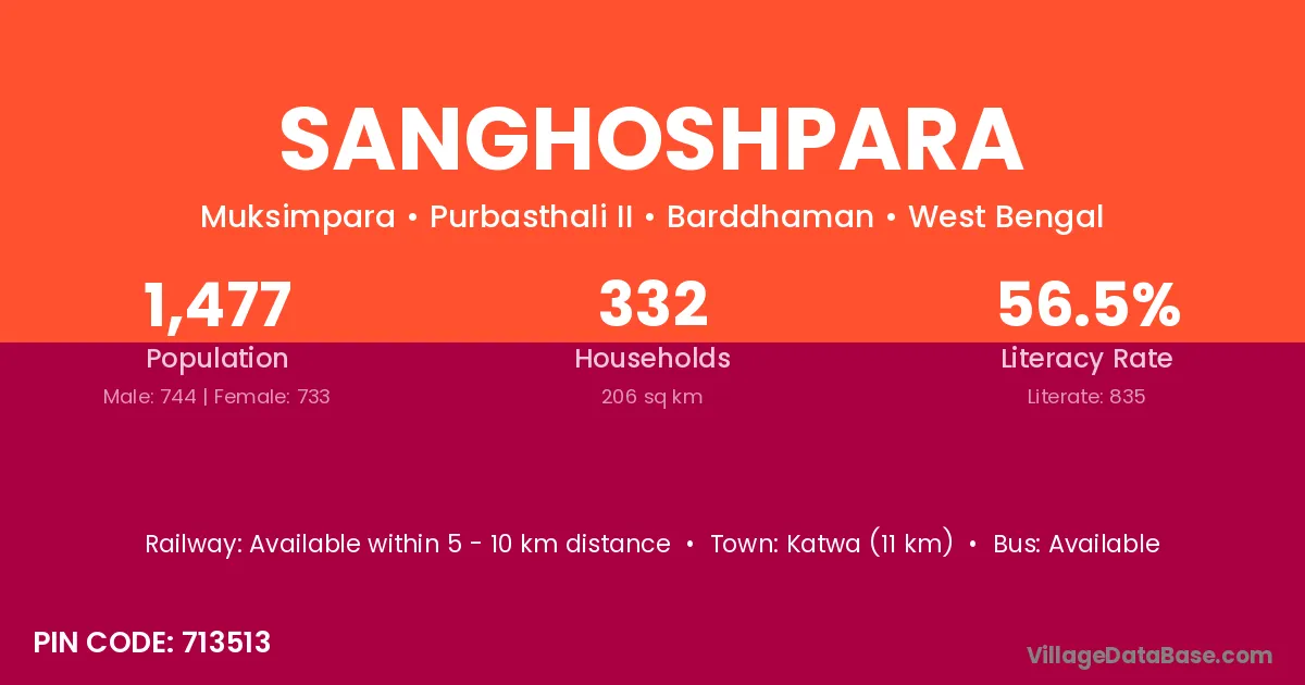 Katwa (11 km) is the nearest town to Sanghoshpara village for major economic activities and is located approximately 11 km away.
