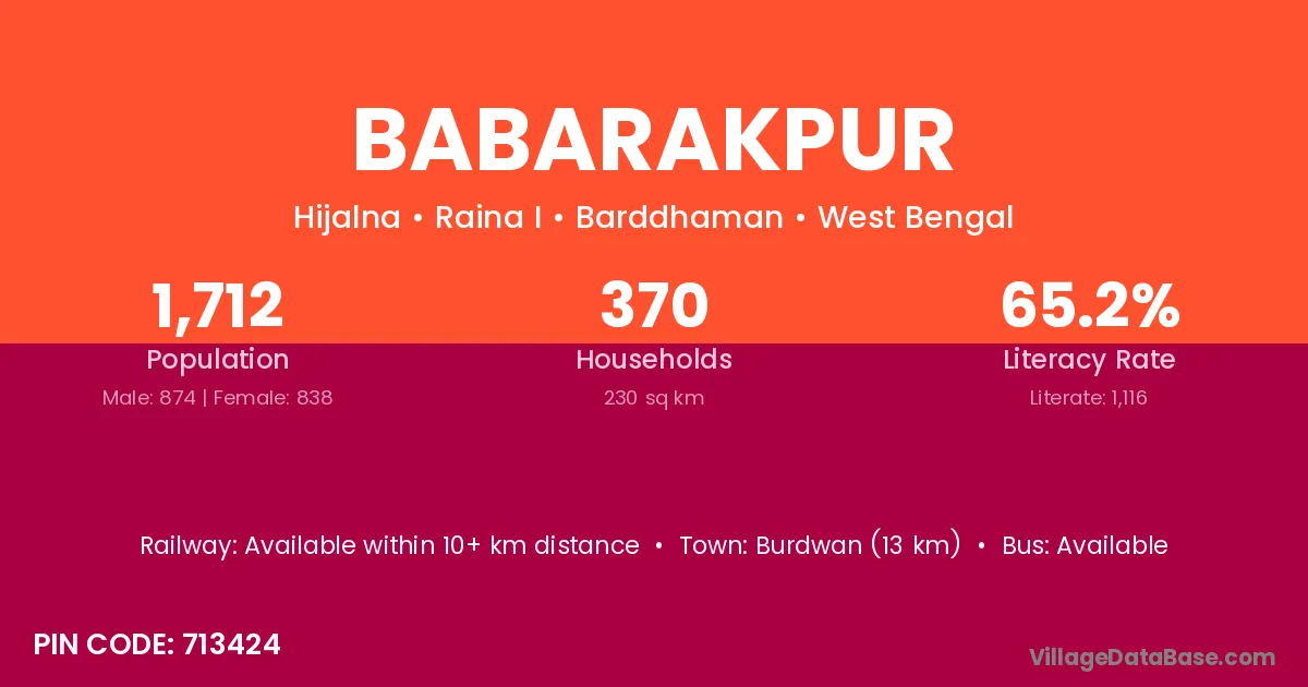 Burdwan (13 km) is the nearest town to Babarakpur village for major economic activities and is located approximately 13 km away.