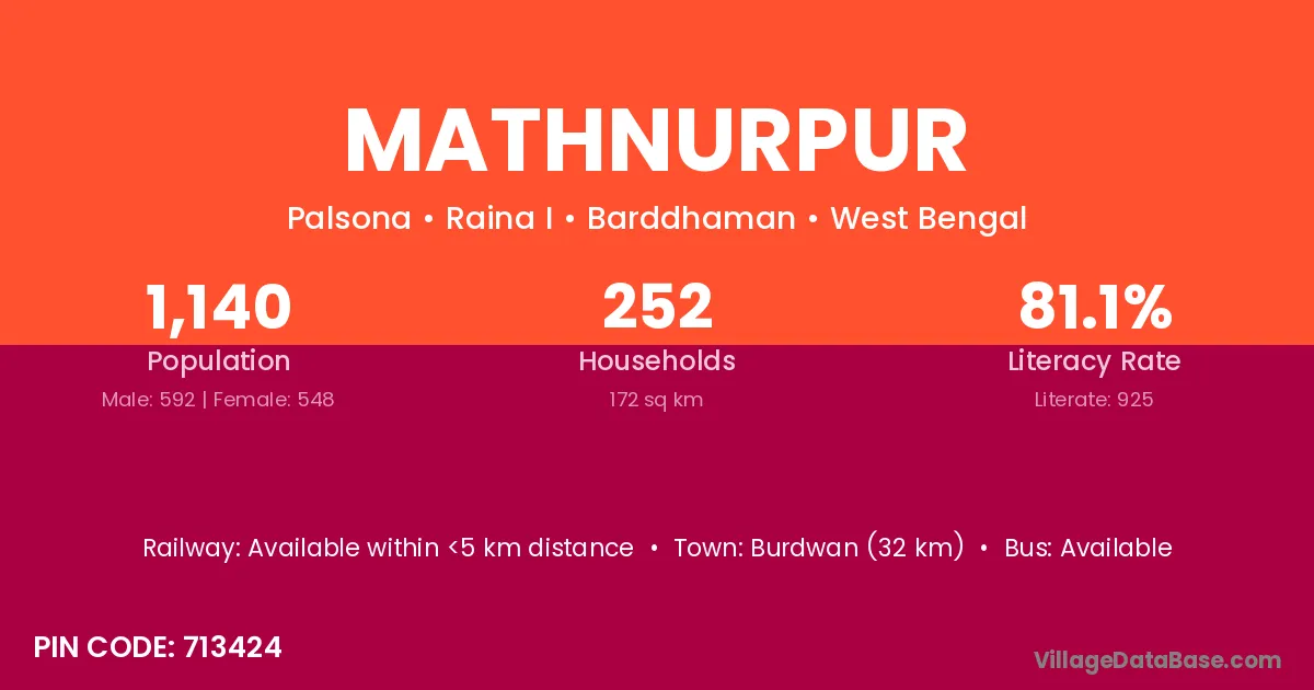 Burdwan (32 km) is the nearest town to Mathnurpur village for major economic activities and is located approximately 32 km away.