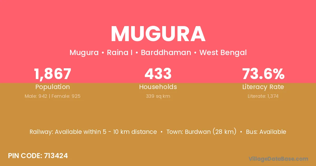 Burdwan (28 km) is the nearest town to Mugura village for major economic activities and is located approximately 28 km away.