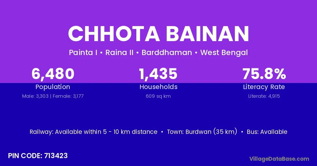 Burdwan (35 km) is the nearest town to Chhota Bainan village for major economic activities and is located approximately 35 km away.