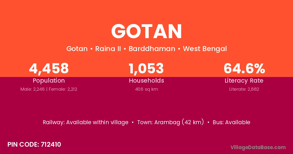Arambag (42 km) is the nearest town to Gotan village for major economic activities and is located approximately 42 km away.