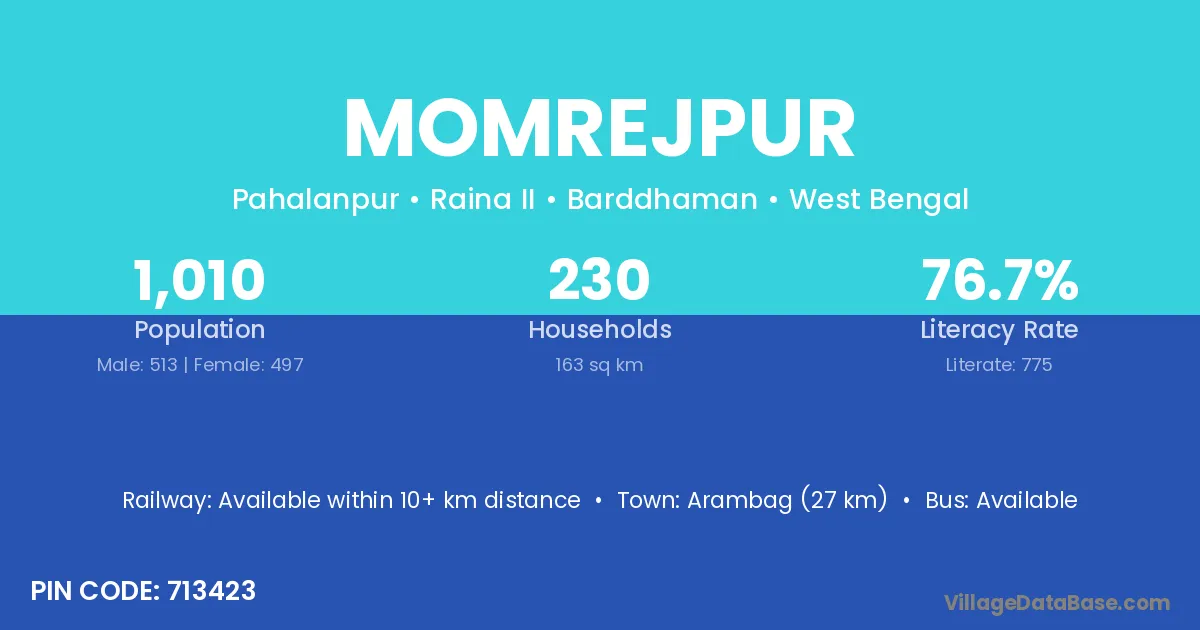 Arambag (27 km) is the nearest town to Momrejpur village for major economic activities and is located approximately 27 km away.