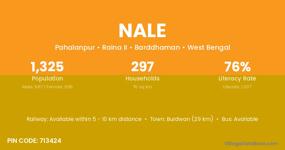 Burdwan (29 km) is the nearest town to Nale village for major economic activities and is located approximately 29 km away.