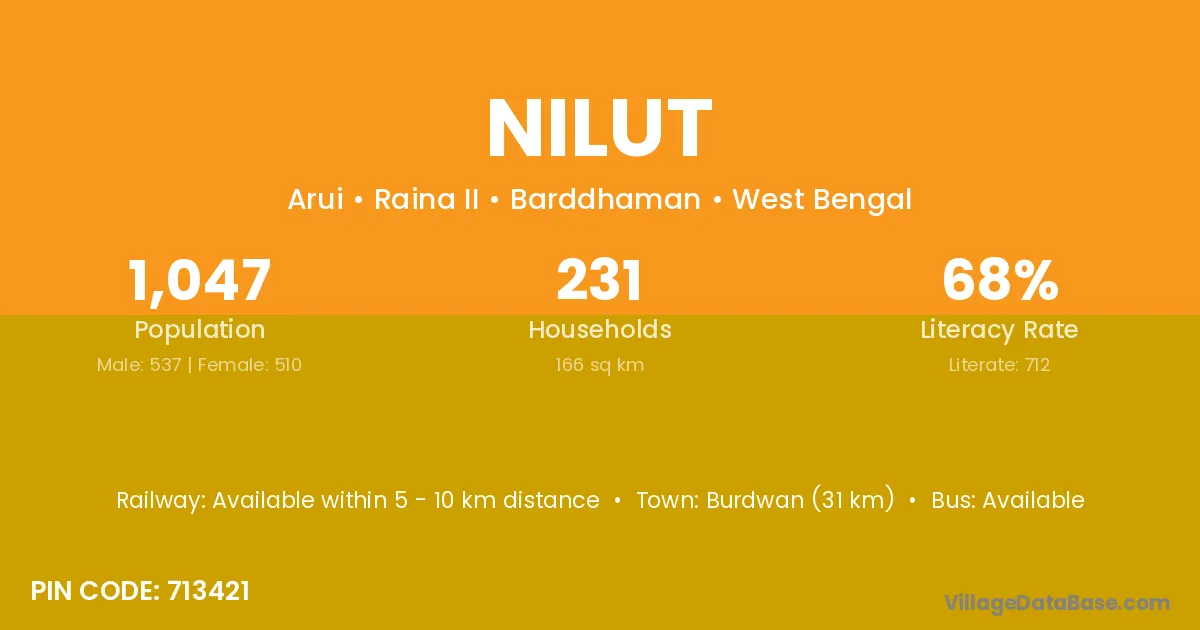 Burdwan (31 km) is the nearest town to Nilut village for major economic activities and is located approximately 31 km away.