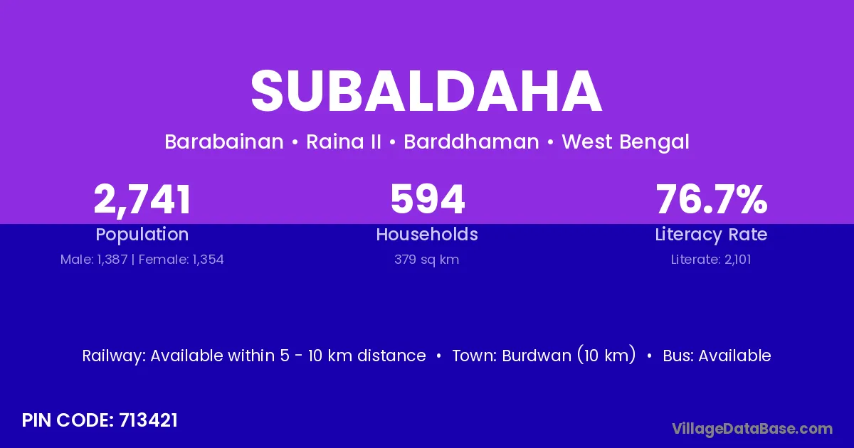Burdwan (10 km) is the nearest town to Subaldaha village for major economic activities and is located approximately 10 km away.