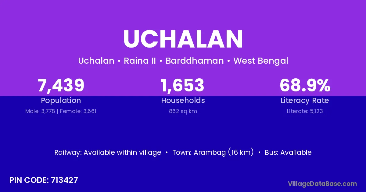 Arambag (16 km) is the nearest town to Uchalan village for major economic activities and is located approximately 16 km away.