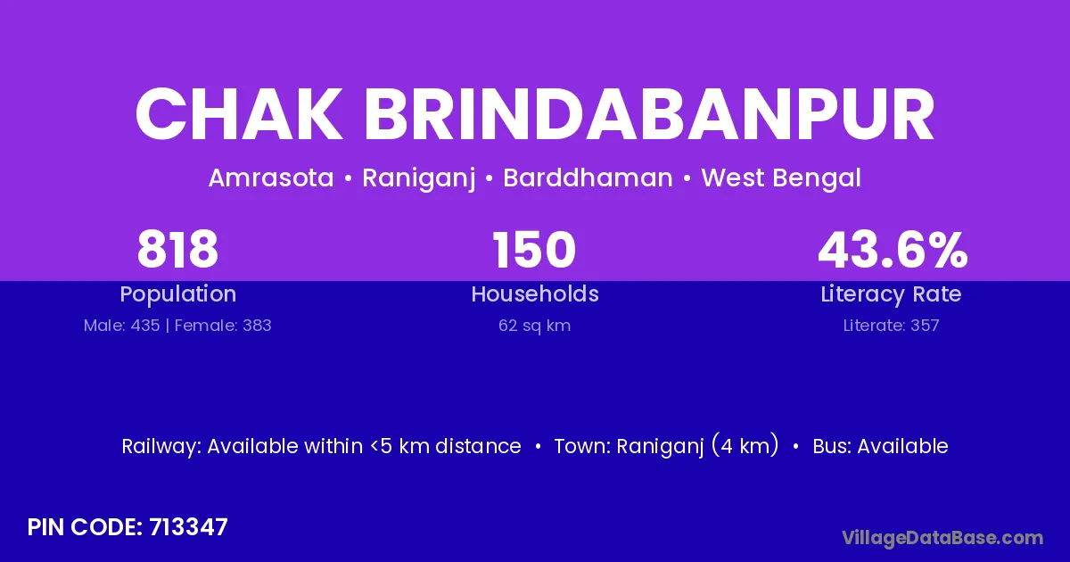 Raniganj (4 km) is the nearest town to Chak Brindabanpur village for major economic activities and is located approximately 4 km away.