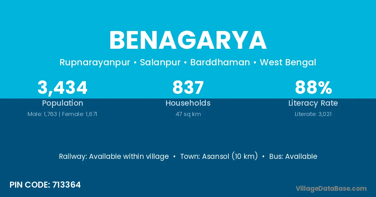 Asansol (10 km) is the nearest town to Benagarya village for major economic activities and is located approximately 10 km away.