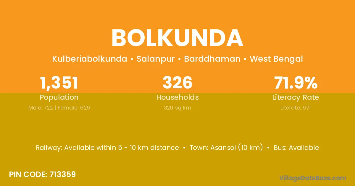 Asansol (10 km) is the nearest town to Bolkunda village for major economic activities and is located approximately 10 km away.