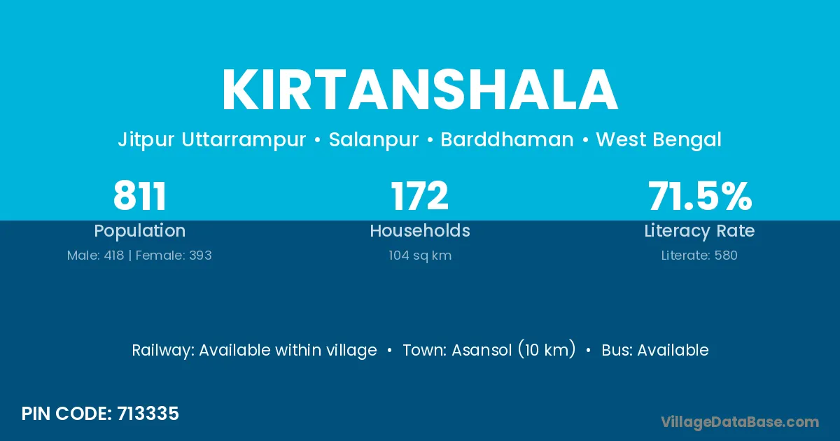Asansol (10 km) is the nearest town to Kirtanshala village for major economic activities and is located approximately 10 km away.