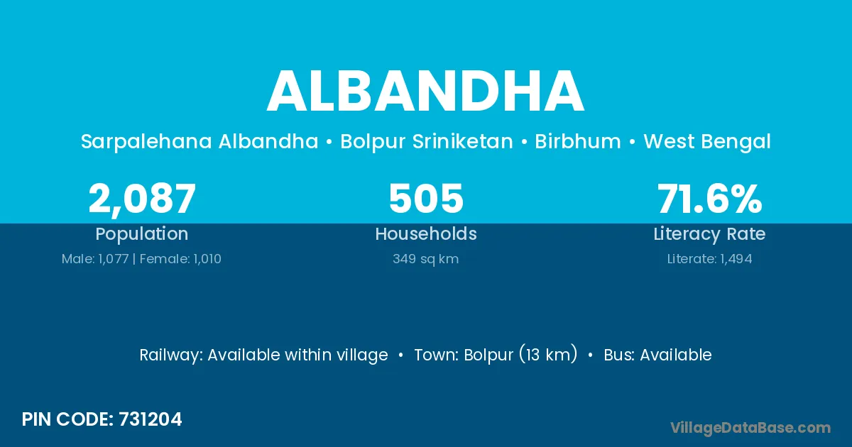 Bolpur (13 km) is the nearest town to Albandha village for major economic activities and is located approximately 13 km away.
