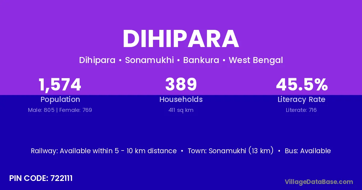 Bolpur (7 km) is the nearest town to Dihipara village for major economic activities and is located approximately 7 km away.