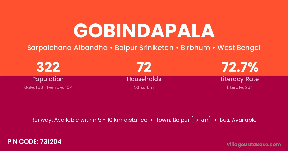 Bolpur (17 km) is the nearest town to Gobindapala village for major economic activities and is located approximately 17 km away.