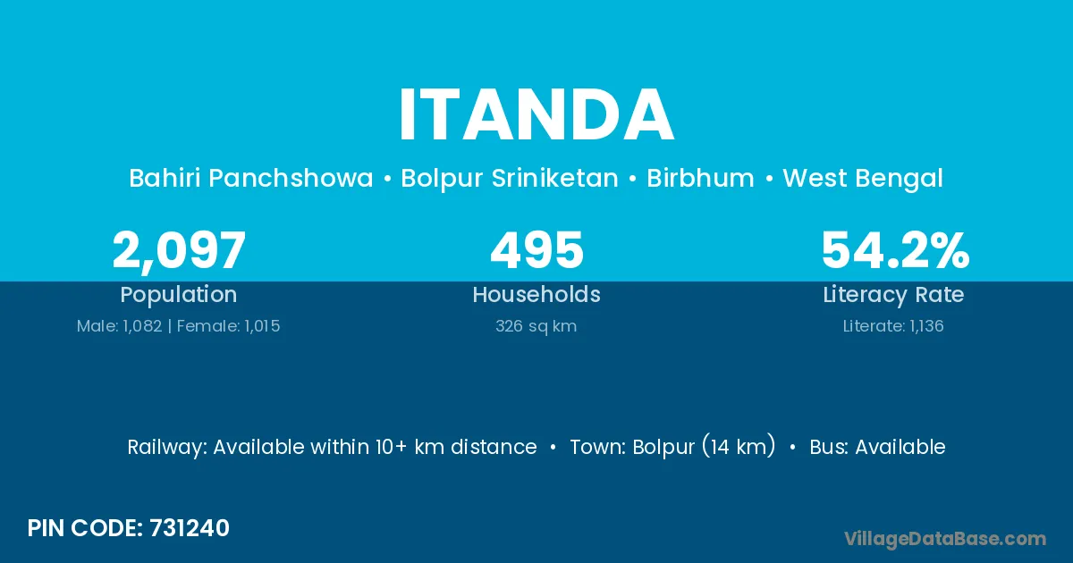 Bolpur (14 km) is the nearest town to Itanda village for major economic activities and is located approximately 14 km away.