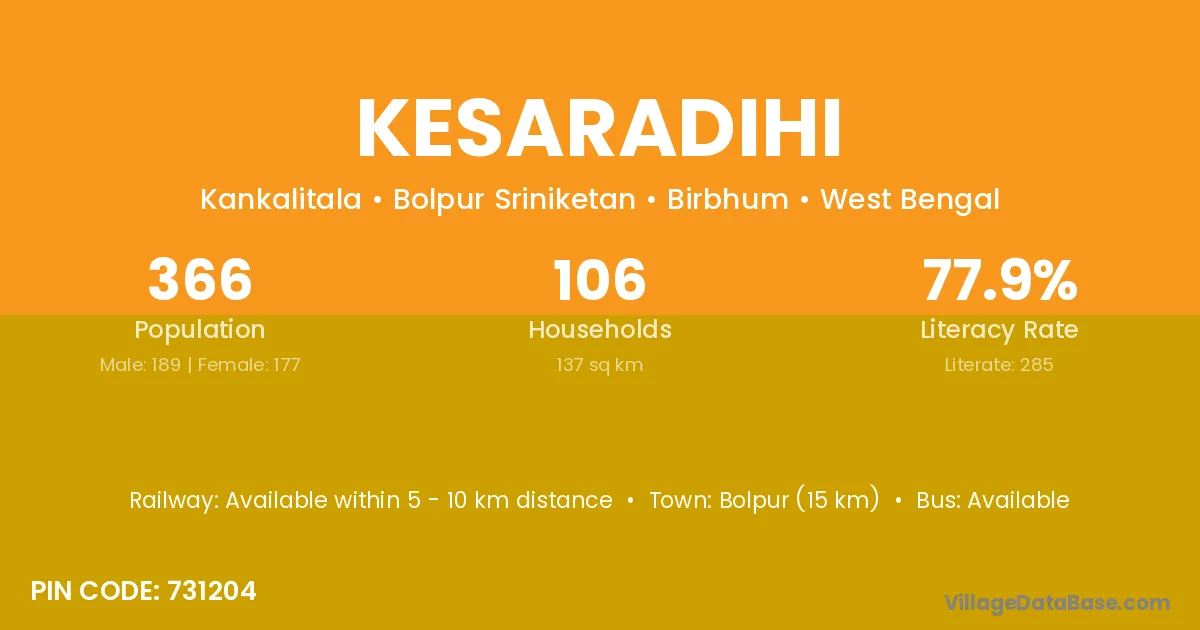 Bolpur (15 km) is the nearest town to Kesaradihi village for major economic activities and is located approximately 15 km away.