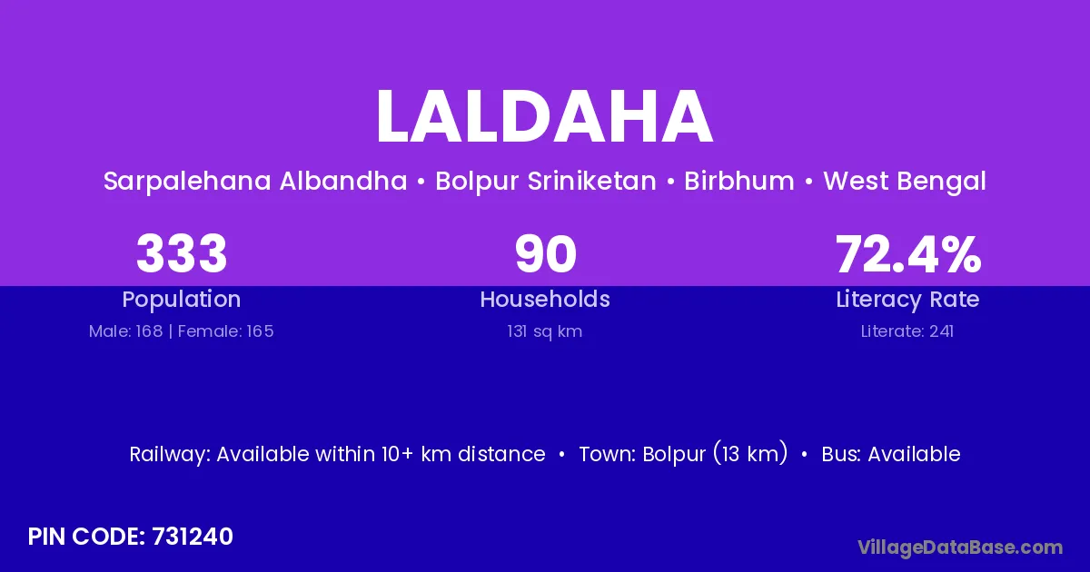 Bolpur (13 km) is the nearest town to Laldaha village for major economic activities and is located approximately 13 km away.