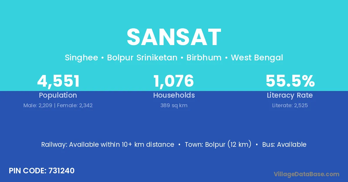 Bolpur (12 km) is the nearest town to Sansat village for major economic activities and is located approximately 12 km away.