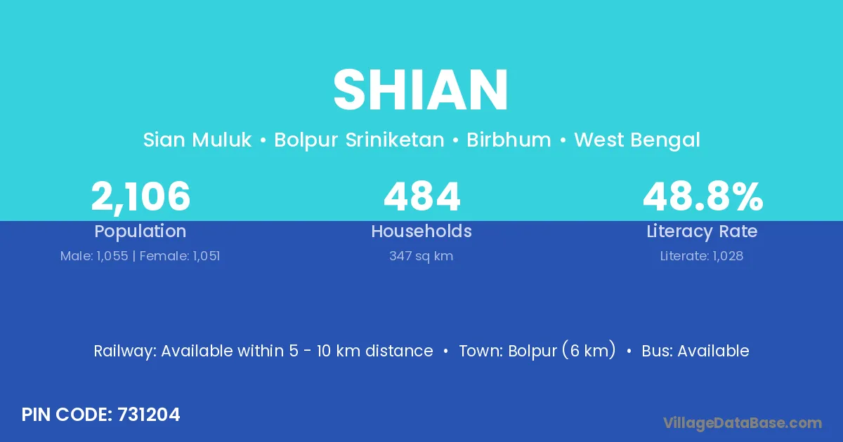 Bolpur (6 km) is the nearest town to Shian village for major economic activities and is located approximately 6 km away.