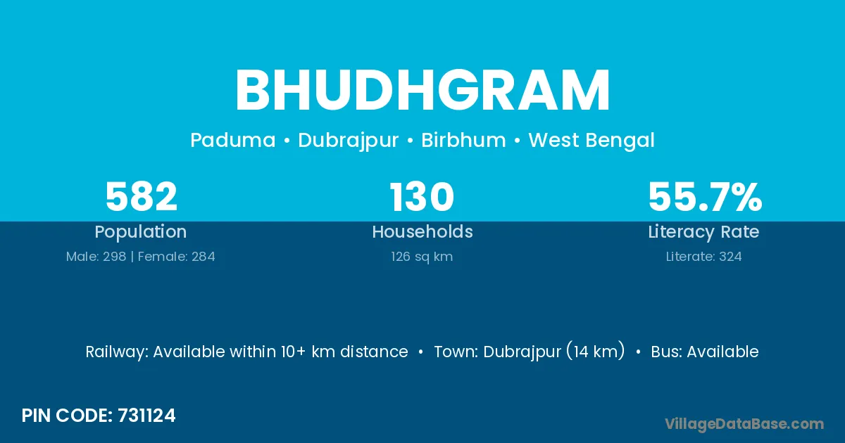 Dubrajpur (14 km) is the nearest town to Bhudhgram village for major economic activities and is located approximately 14 km away.