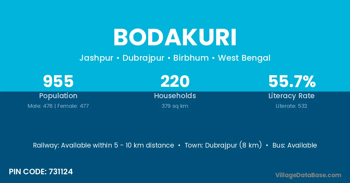 Dubrajpur (8 km) is the nearest town to Bodakuri village for major economic activities and is located approximately 8 km away.