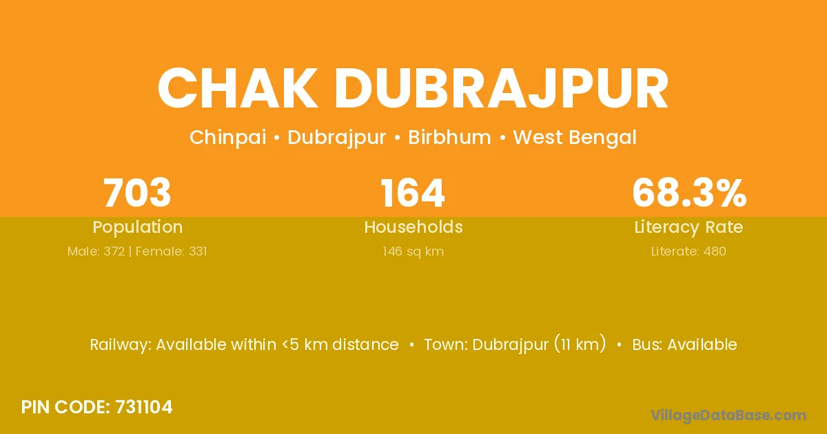Dubrajpur (11 km) is the nearest town to Chak Dubrajpur village for major economic activities and is located approximately 11 km away.