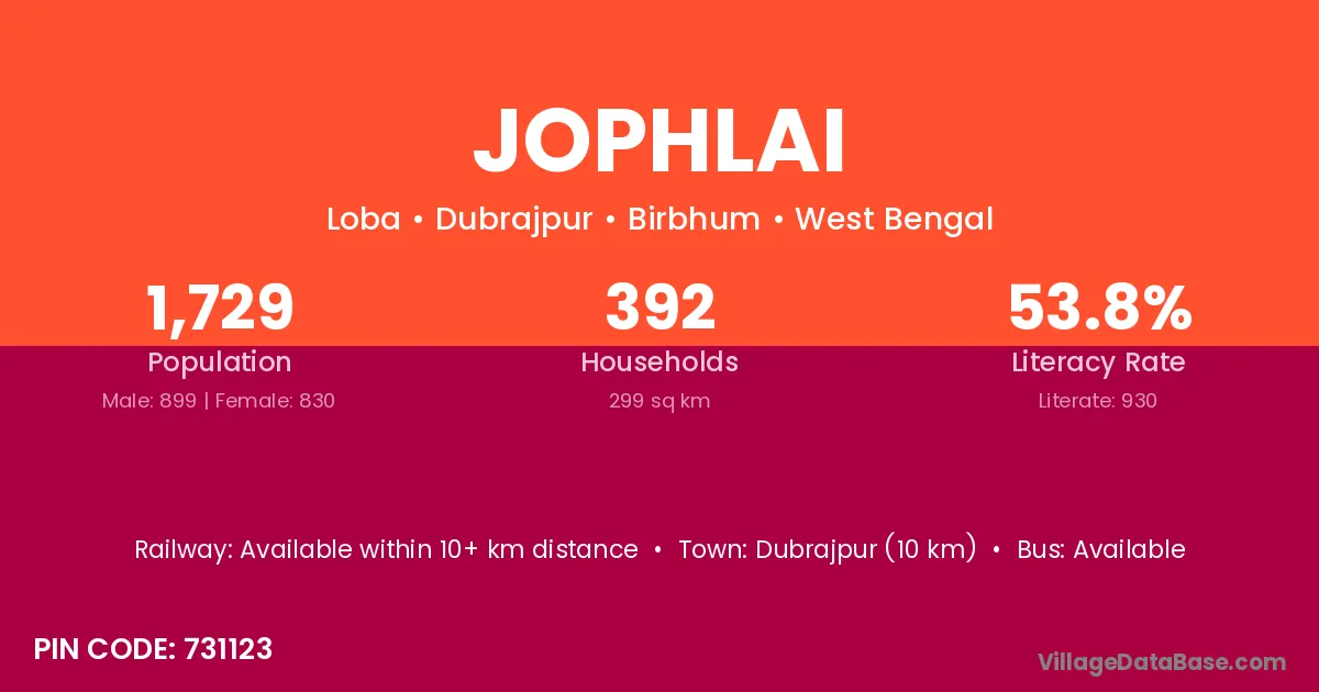 Dubrajpur (10 km) is the nearest town to Jophlai village for major economic activities and is located approximately 10 km away.