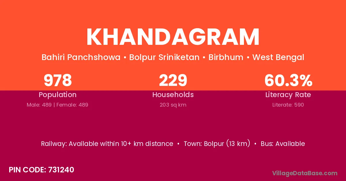 Dubrajpur (17 km) is the nearest town to Khandagram village for major economic activities and is located approximately 17 km away.