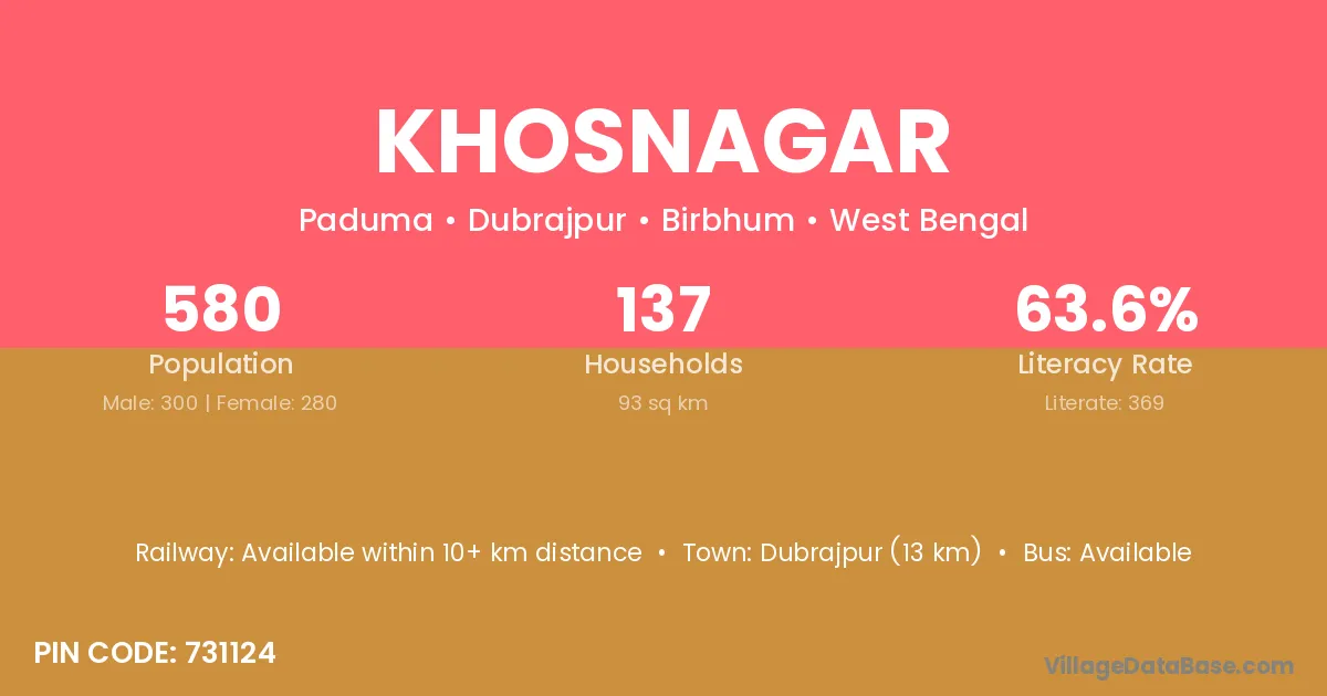 Dubrajpur (13 km) is the nearest town to Khosnagar village for major economic activities and is located approximately 13 km away.