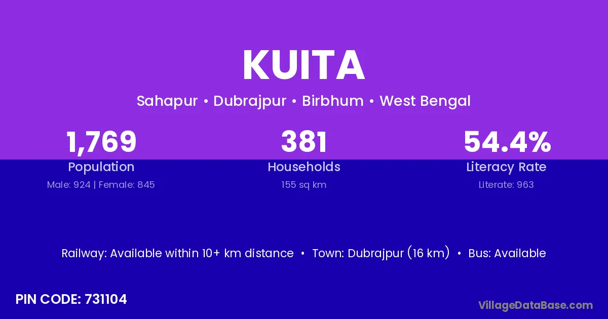 Dubrajpur (16 km) is the nearest town to Kuita village for major economic activities and is located approximately 16 km away.