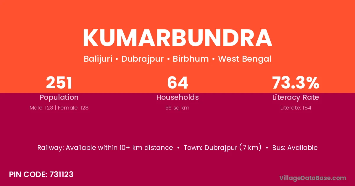 Dubrajpur (7 km) is the nearest town to Kumarbundra village for major economic activities and is located approximately 7 km away.
