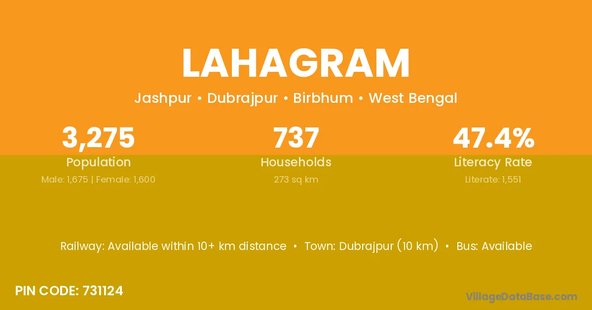 Dubrajpur (10 km) is the nearest town to Lahagram village for major economic activities and is located approximately 10 km away.