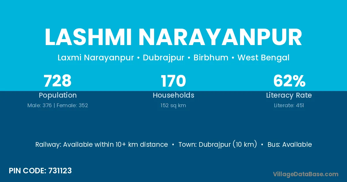 Dubrajpur (10 km) is the nearest town to Lashmi Narayanpur village for major economic activities and is located approximately 10 km away.
