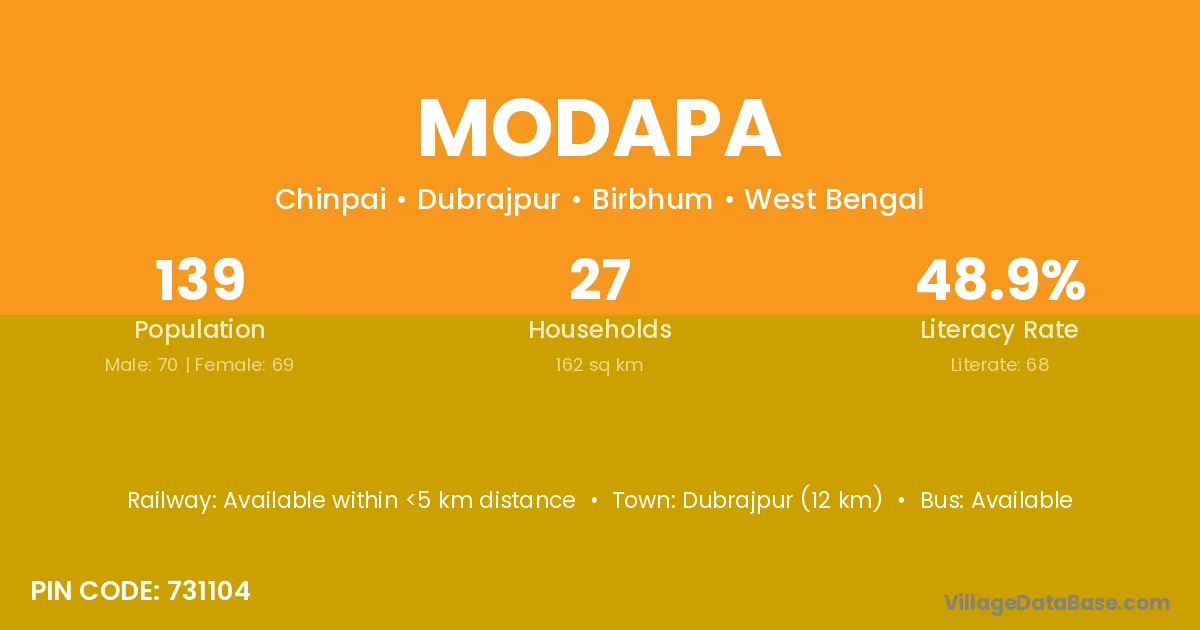 Dubrajpur (12 km) is the nearest town to Modapa village for major economic activities and is located approximately 12 km away.