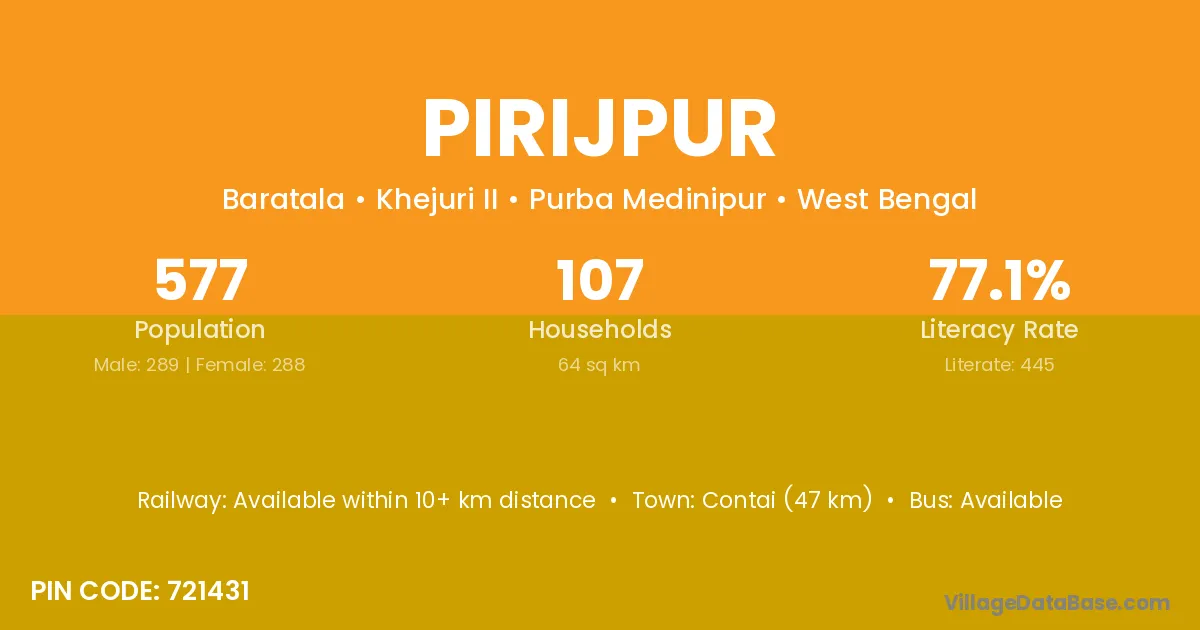 According to Census 2011 information, the village code of Pirijpur village is 731124.