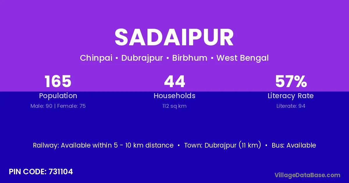 Dubrajpur (11 km) is the nearest town to Sadaipur village for major economic activities and is located approximately 11 km away.
