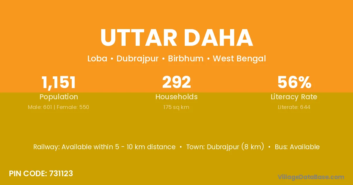 Dubrajpur (8 km) is the nearest town to Uttar Daha village for major economic activities and is located approximately 8 km away.