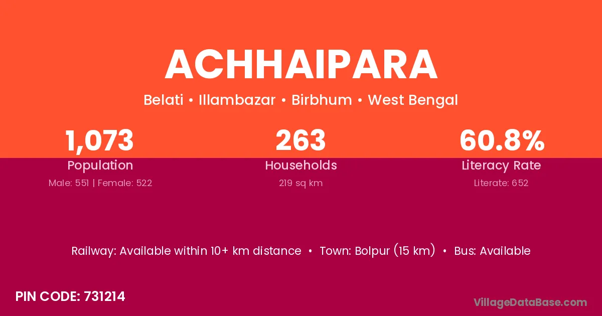Bolpur (15 km) is the nearest town to Achhaipara village for major economic activities and is located approximately 15 km away.