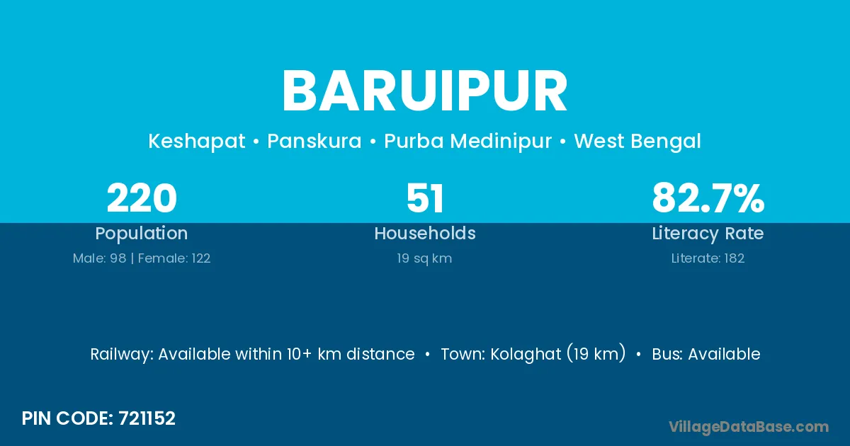 Bolpur (20 km) is the nearest town to Baruipur village for major economic activities and is located approximately 20 km away.