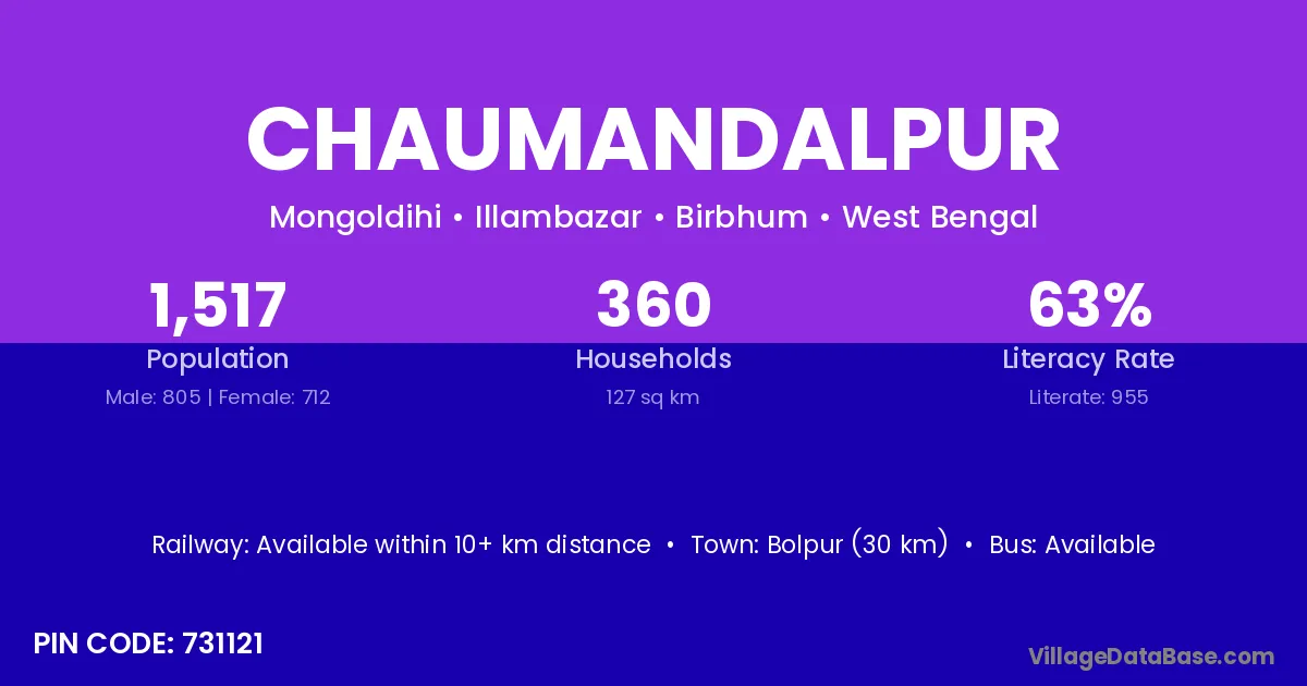 Bolpur (30 km) is the nearest town to Chaumandalpur village for major economic activities and is located approximately 30 km away.