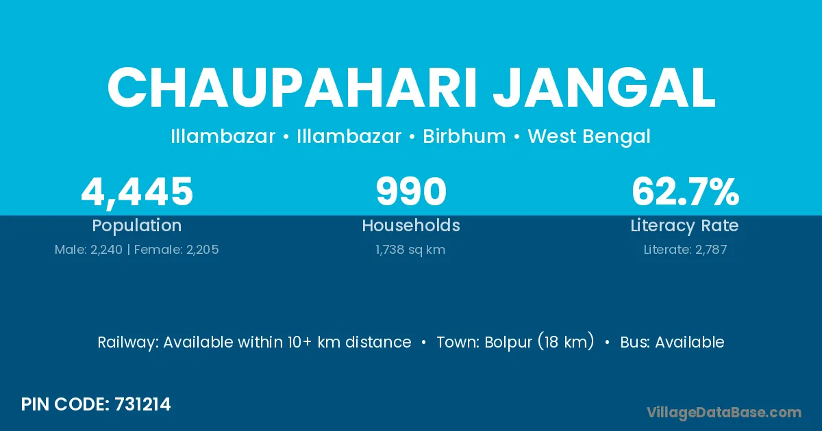 Bolpur (18 km) is the nearest town to Chaupahari Jangal village for major economic activities and is located approximately 18 km away.