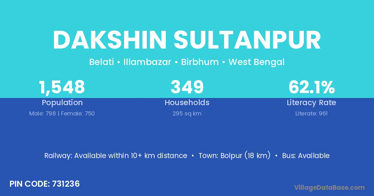 Bolpur (18 km) is the nearest town to Dakshin Sultanpur village for major economic activities and is located approximately 18 km away.