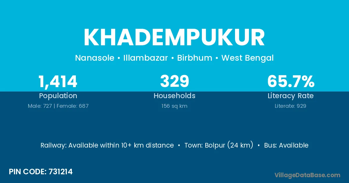 Bolpur (24 km) is the nearest town to Khadempukur village for major economic activities and is located approximately 24 km away.