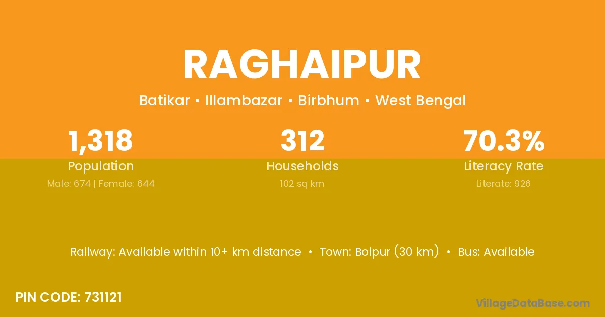 Bolpur (30 km) is the nearest town to Raghaipur village for major economic activities and is located approximately 30 km away.